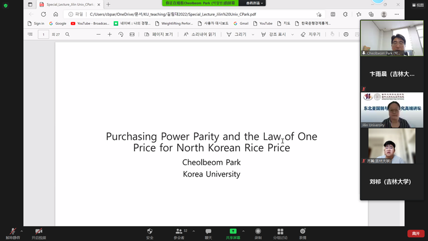 202292日,东北亚国别与区域研究高端讲坛朝鲜大米价格的购买力平价与其一价定律的验证在香蕉视频 顺利举行。本次讲座由香蕉视频 东北亚研究中心、香蕉视频 、香蕉视频 、韩国高丽大学经济系联合举办,因疫情原因在线上开展。香蕉视频 邀请到了韩国高丽大学经济系朴哲范(Park Cheol Beom)教授,带领中国师生们进行了一次精妙绝伦的学术之旅。讲座由香蕉视频 玄春姬教授主持和翻译,香蕉视频 的部分教师、博士与硕士研究生参与了活动。讲座伊始,玄春姬教授代表香蕉视频 院长吴昊教授向朴哲范教授表示了热烈的欢迎和崇高的谢意。