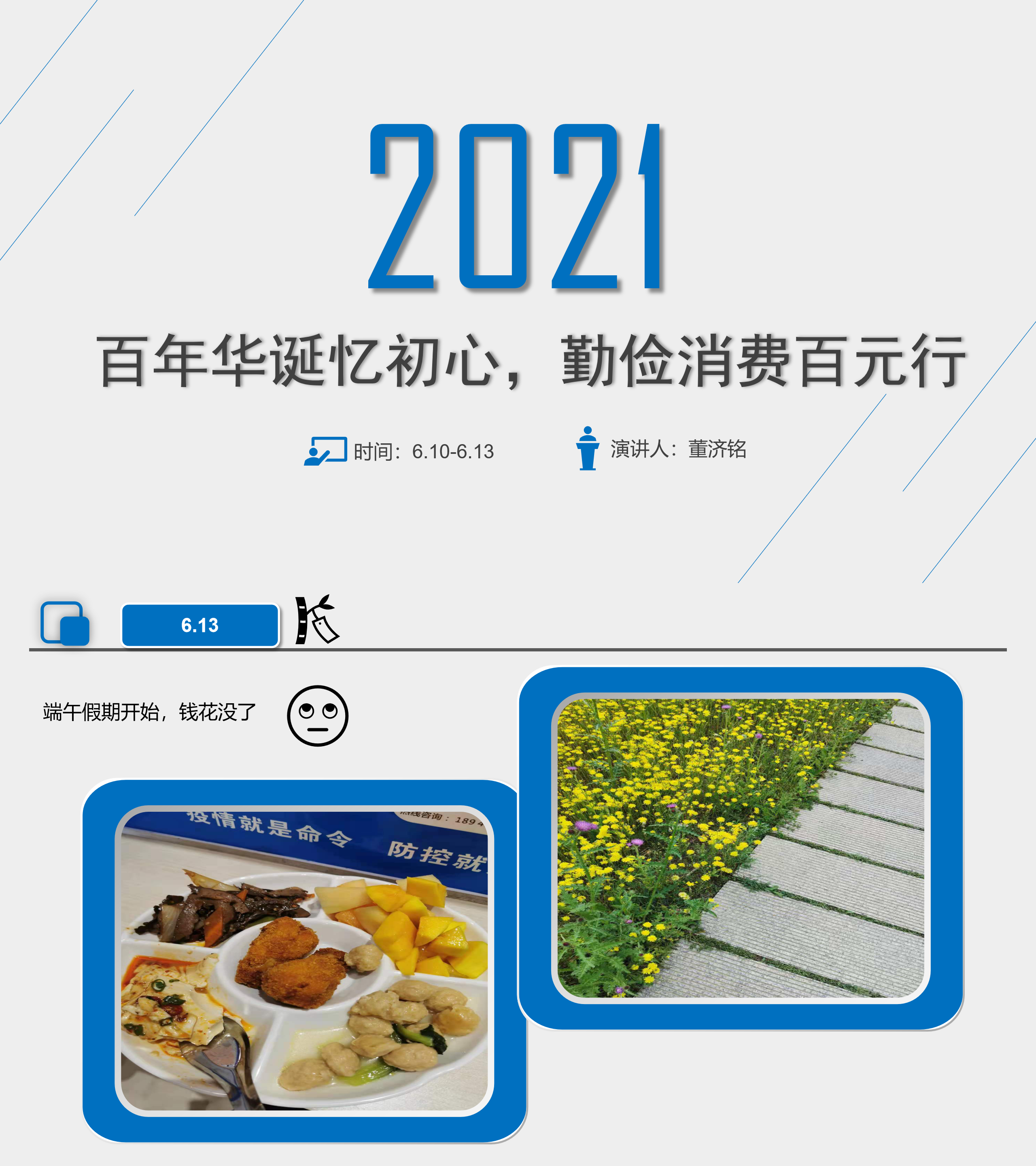 校园生活,并且尽可能地丰富多彩,可涉及到饮食、交通、学习、运动、娱乐等多方面;实际消费情况采取图片或者视频等方式进行记录,最终做成PPT或vlog等形式进行展示。通过评选确定了6名同学的作品获奖。