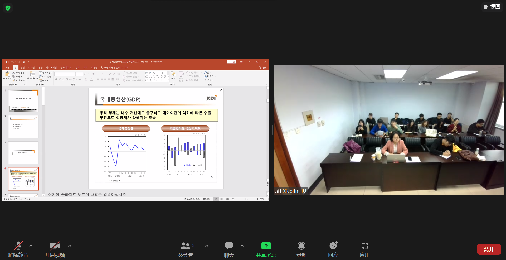 讲座伊始,千博士列出韩国的GDP增速、通货膨胀率、失业率等指标并指出新冠疫情后与欧美国家相比,韩国交出的经济发展成绩单相对较好。韩国目前接近完全就业水平,但通胀压力较大。日前,对韩国下半年经济发展的预测较悲观,因为韩国的经济发展离不开中国,中国疫情防控政策的动态变化不仅影响着自身经济的发展更对韩国经济有着深远影响。