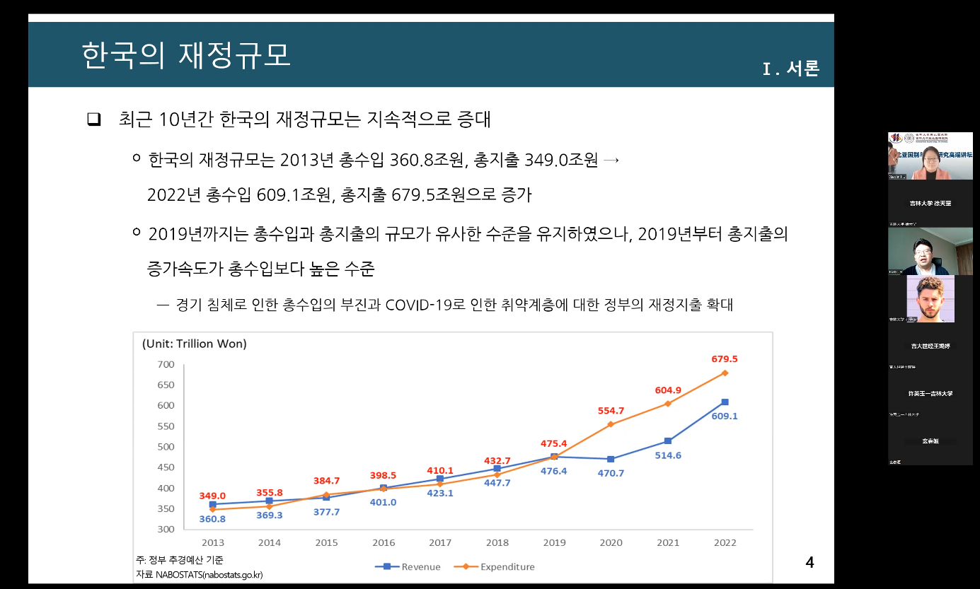 朴博士首先介绍了税收预测在韩国政府编制年度预算案前期工作中的重要性,之后详细分析2021年韩国预算预测误差,以及预算误差导致政府财政支出效率低下、对韩国经济政治产生重大影响等后果。最后,朴博士介绍了韩国的税制体系、分析韩国国会进行税收预测出现误差的原因,并对其带来的影响进行了详细的介绍。