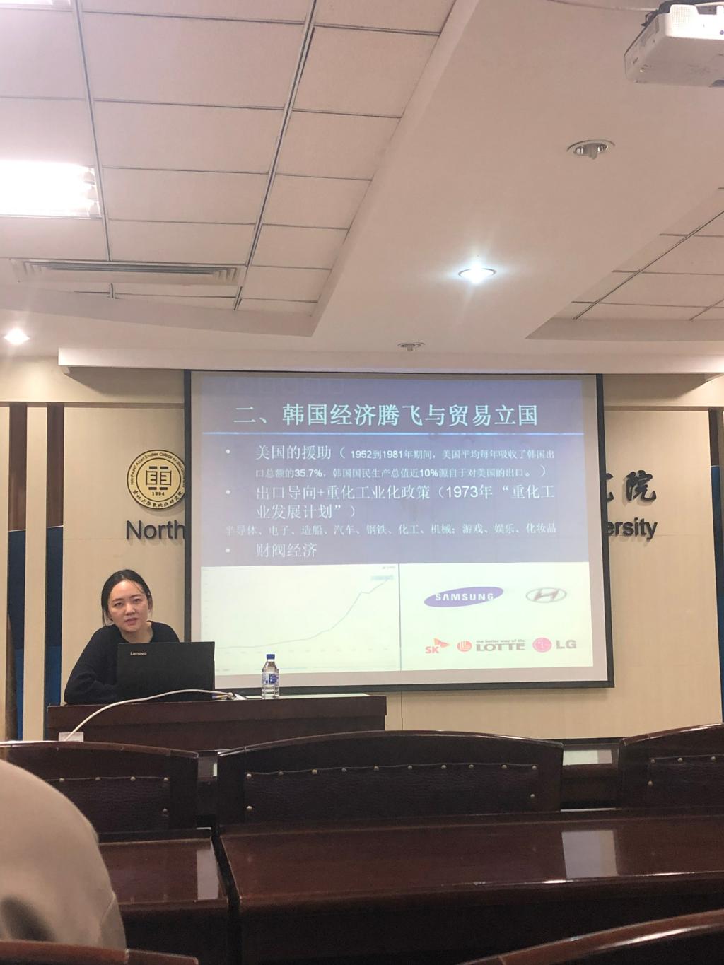 金香丹老师带领学生回顾了韩国经济的发展历程,介绍了韩国经济的现状与特点,韩国经济的困境与安全方面的考量,并且展望了韩国经济未来前景。另外,王箫轲副教授补充了关于韩国经济与中国经济紧密的内在联系,并且评价了学生的研究作业。两位老师循循善诱的讲解使得参与本次培训的师生对于韩国经济有了更加深入的学习和认知。