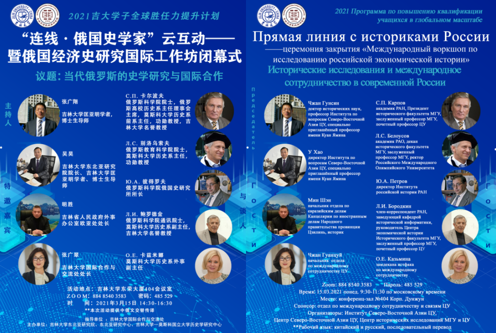 From March 2nd to 15th, 2021, the 2021 Jilin University Global Competency Enhancement Program: International Workshop on Russian Economic History Research was successfully held in Jilin University. The event was co-sponsored by the Northeast Asian Studies College of Jilin University, the Northeast Asian Research Center of Jilin University, and the Jilin University-Moscow State University History Research Center, and guided by the Office of Global Engagement of Jilin University, and was carried out online and offline at the same time. More than 10 top scholars in the field of Russian historiography, including experts and scholars from many fraternal universities and scientific research institutions in China, as well as academicians С.П. Karpov, Academician Л.С. Belousov, Academician Л.И. Borodkin, Professor Ю.А. Petrov and other top scholars from Moscow State University and the Russian Academy of Sciences, gathered on line to build quality universities together, bringing a wonderful historical feast to the students of Jilin University , and at the same time deeply discussed and looked forward to the results and development prospects of cooperation between China and Russia in the field of Russian history. The two-week series of international workshops culminated on March 15th .