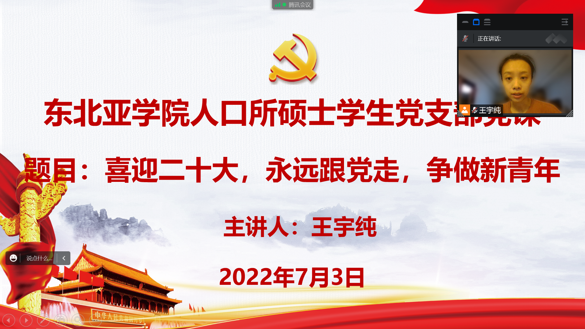 历史与文化研究所硕士学生党支部书记赵子恒以 “喜迎二十大,做好接班人”为题讲党课,人口资源与环境研究所硕士学生党支部书记王宇纯以“喜迎二十大、永远跟党走、争做新青年”为题讲党课,与支部党员同志一起重温了习近平总书记的一系列重要讲话,明确了青年党员的责任。青年一代是民族的希望,是国家的栋梁,肩负着祖国建设的重担。社会主义现代化需要青年去建设,中华民族的伟大复兴需要青年去奋斗。党员们纷纷表示,要立牢为国为民之志,淬炼奋勇担当之肩,保持砥砺奋斗之姿,增强干事成事之力。