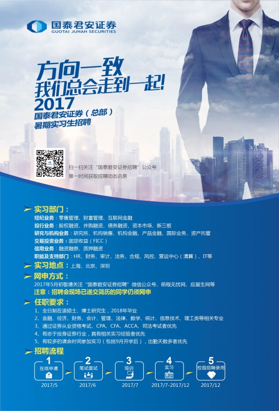 国泰君安证券(总部)2017暑期实习项目将延续“培训+实习+录用”的培养模式,本项目中的所有实习生,将作为2018校园招聘的人才储备,从中择优录用。