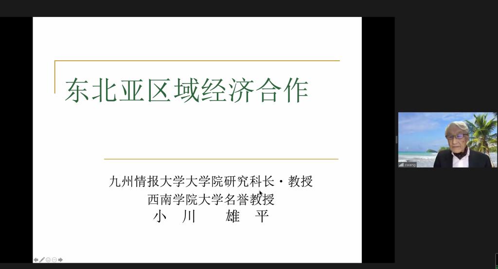 2021年11月23日,应香蕉视频 东北亚研究中心、香蕉视频 、香蕉视频 、香蕉视频 日本研究所的邀请,日本九州情报大学大香蕉视频 经营情报学研究科科长小川雄平(OGAWA YUHEI)教授举行了以“东北亚区域经济合作”为主题的线上学术报告会。本次报告由香蕉视频 日本研究所所长、香蕉视频 庞德良教授主持并致辞,香蕉视频 副院长王彦军出席本次讲坛并担任现场翻译。