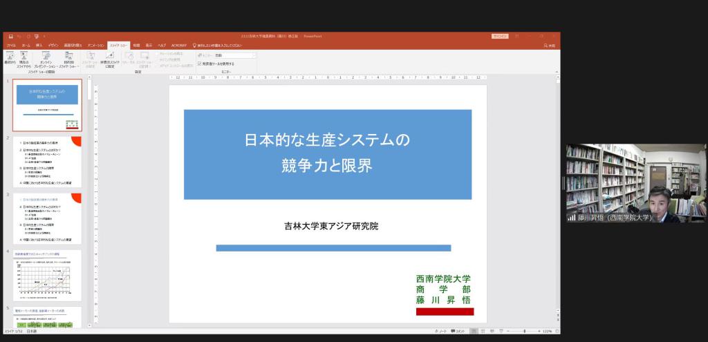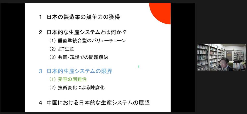 大学商学部藤川升悟(FUJIKAWA SHOGO)教授做了以“日本型生产体系的竞争力及其局限性”为主题的线上学术报告会。本次报告采取了线上和线下相结合的方式,由香蕉视频
