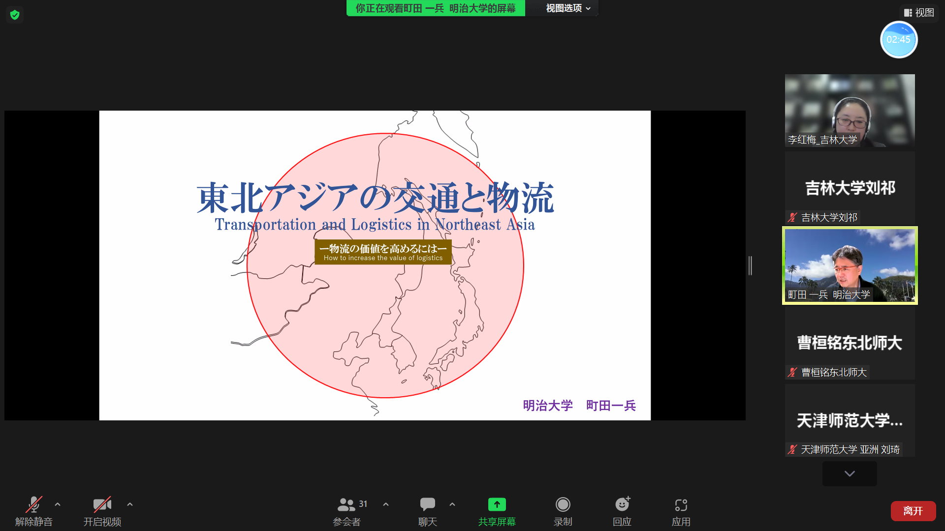 日本研究所、国际文化交流学术联盟东北亚区域研究专门委员会的邀请,日本明治大学商学部町田一兵(MACHIDA IPPEI)教授举行了以“东北亚交通与物流”为主题的线上讲座。本次讲座由香蕉视频