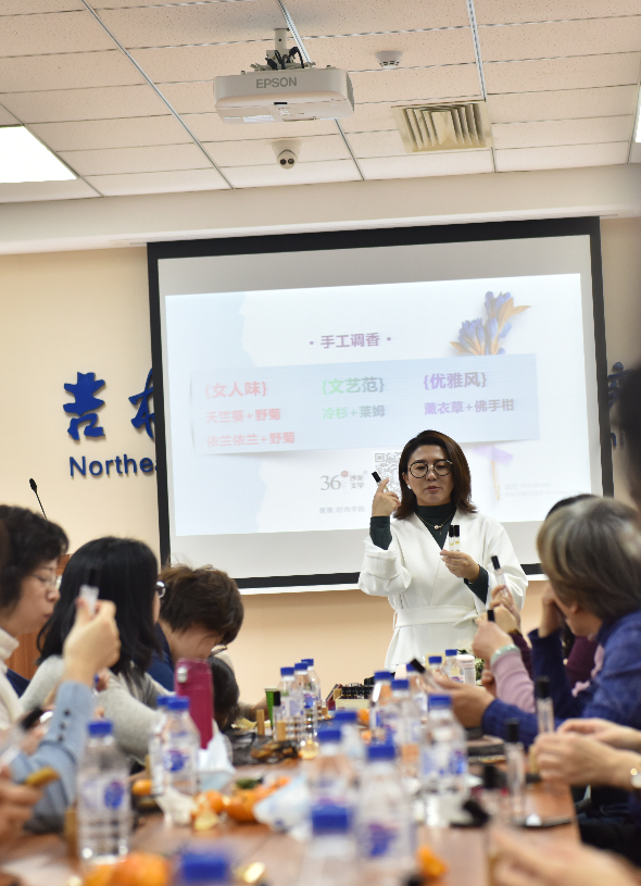 聂老师向大家讲解了精油的由来和各种不能功能,介绍了芳香疗法的功效,然后和大家分享了薄荷、野橘和茶树精油,示范如何正确使用。聂老师为每位老师准备了大马士革纯度玫瑰精油作为基底液,大家亲手调配了自己喜欢的精油。生姜精油和鼠尾草精油组合有暖宫效果,薄荷精油和野橘精油组合有提神功能,这两款最受大家喜爱。