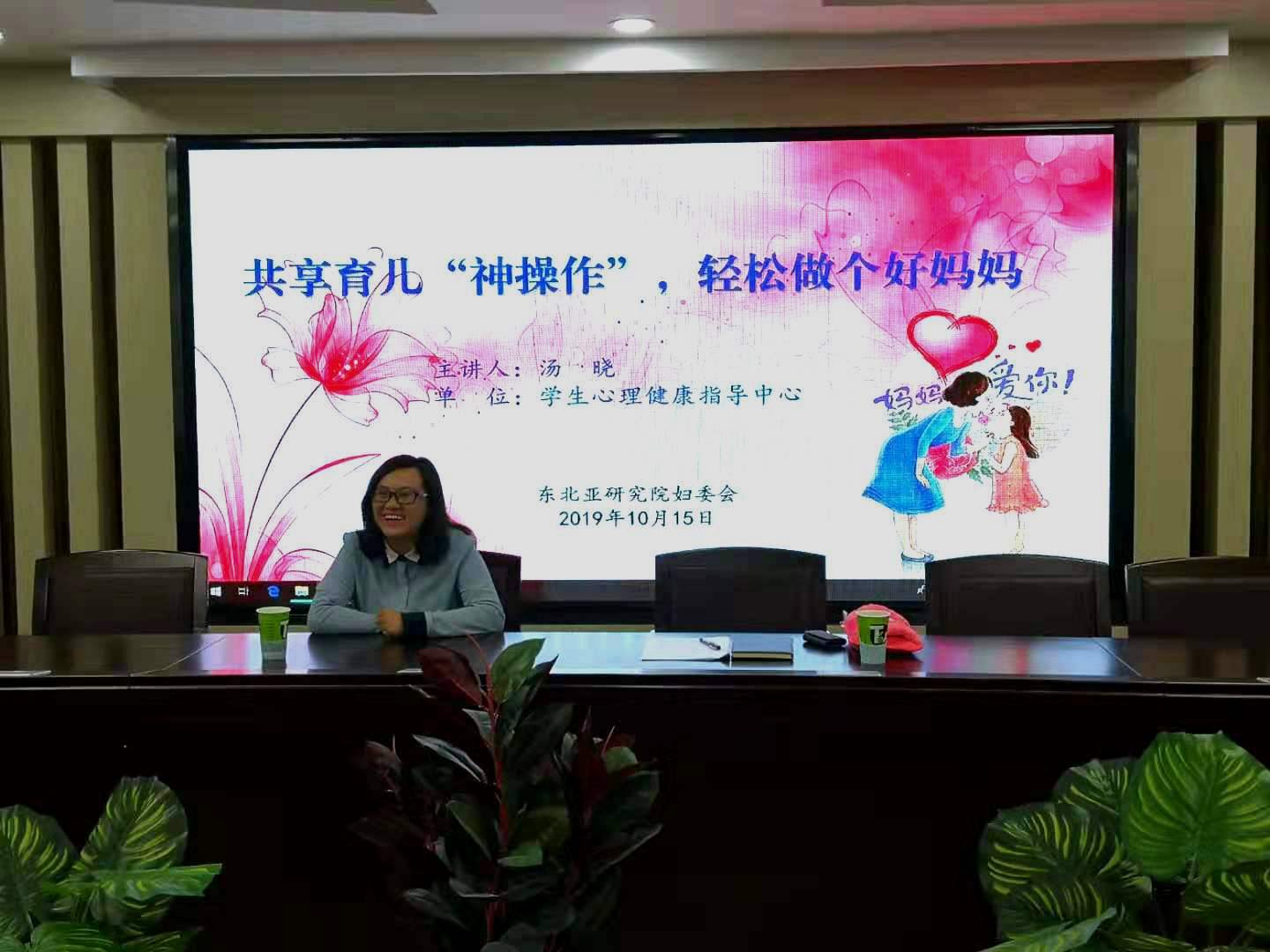 中心工作,深入学习习近平总书记的重要论述和讲话精神。守初心,担使命,不断创新工作思路,本着更好的为女教工服务的初衷,于 2019年10月15日下午,院妇委会邀请心理健康指导中心汤晓老师举办了“共享育儿‘神操作’ 轻松做个好妈妈”幼儿心理健康知识讲座。