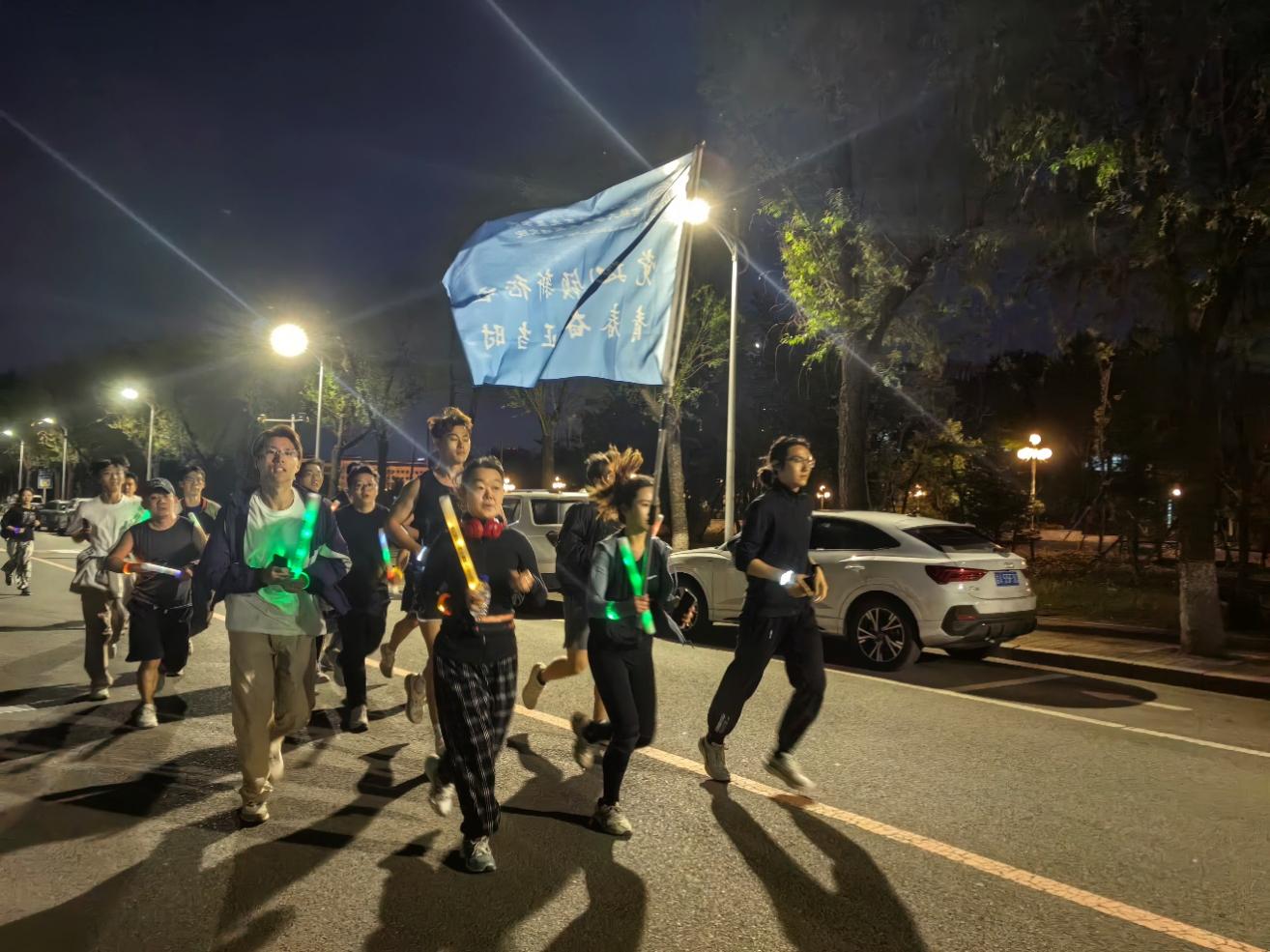 活动首日,负责人首先强调了夜跑的安全事项,随着领跑同学扛着院旗出发,为期五天的荧光夜跑活动正式开始。从匡亚明楼到宋治平体育馆,同学们佩戴荧光手环,挥舞荧光棒,用脚步踏出青春印记,在校园尽情挥洒汗水。