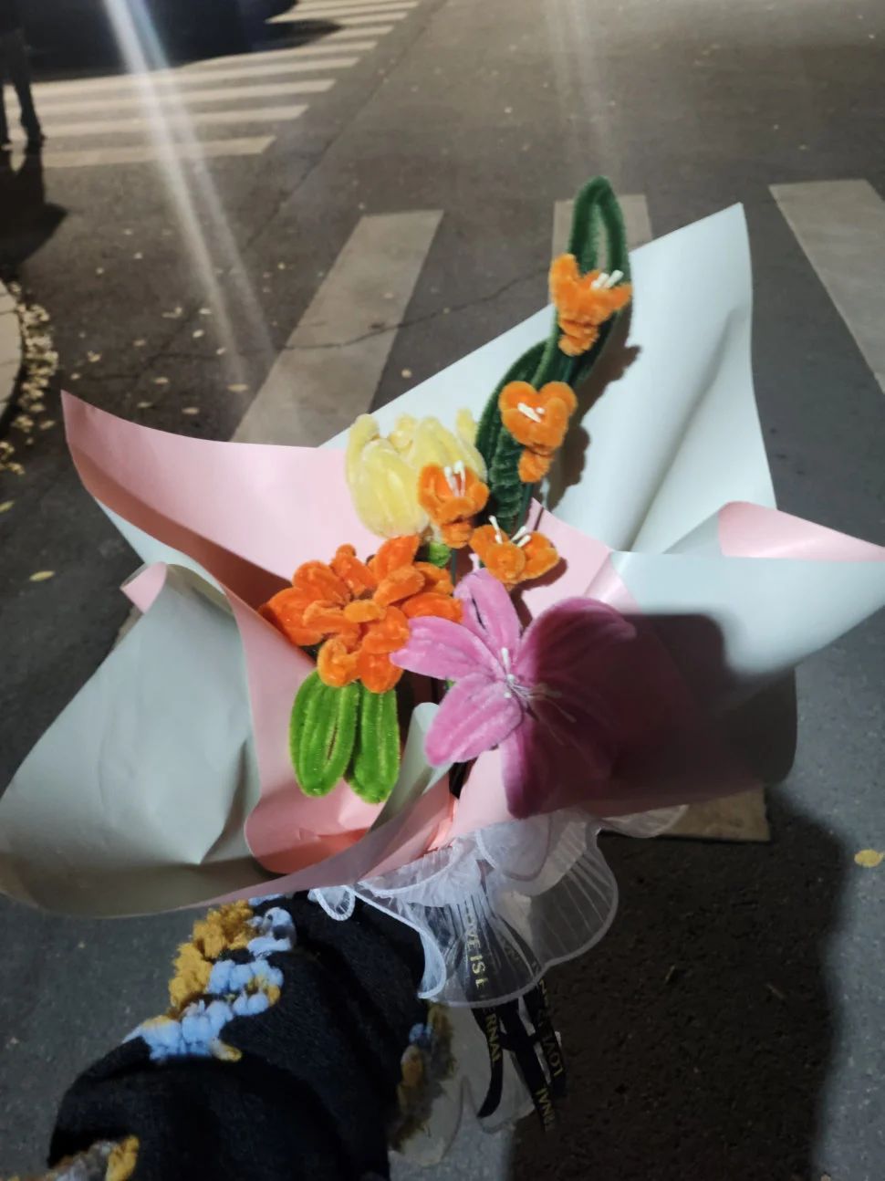 活动组织者为同学们准备了材质各异、色彩多元的扭扭棒,同时为了充分满足同学们的自由创作需求,还采购了包装纸、花架、小眼睛和钻石贴纸等材料。制作过程中,同学们各取所需、专心致志地创作属于自己独一无二的扭扭棒作品。有的同学由于制作得较好,被大家自发地当成了“小老师”,同学们围坐在一起交流讨论、互相帮助,以自己当下的状态和情绪为依托,伴随着平和放松的轻音乐,共同“扭出”自己想象中的作品。